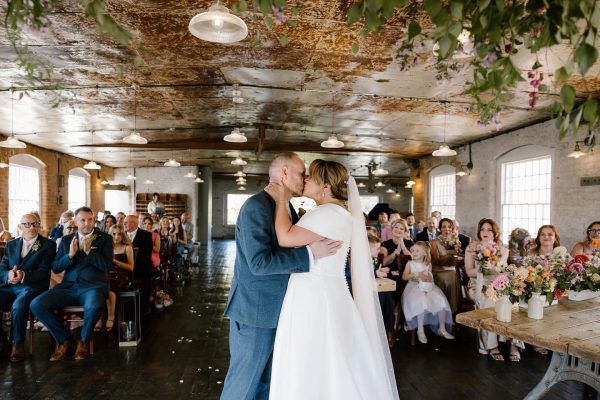 Hollie & George opted for simple green and white florals to complement our industrial venue, along with personal touches throughout the day.